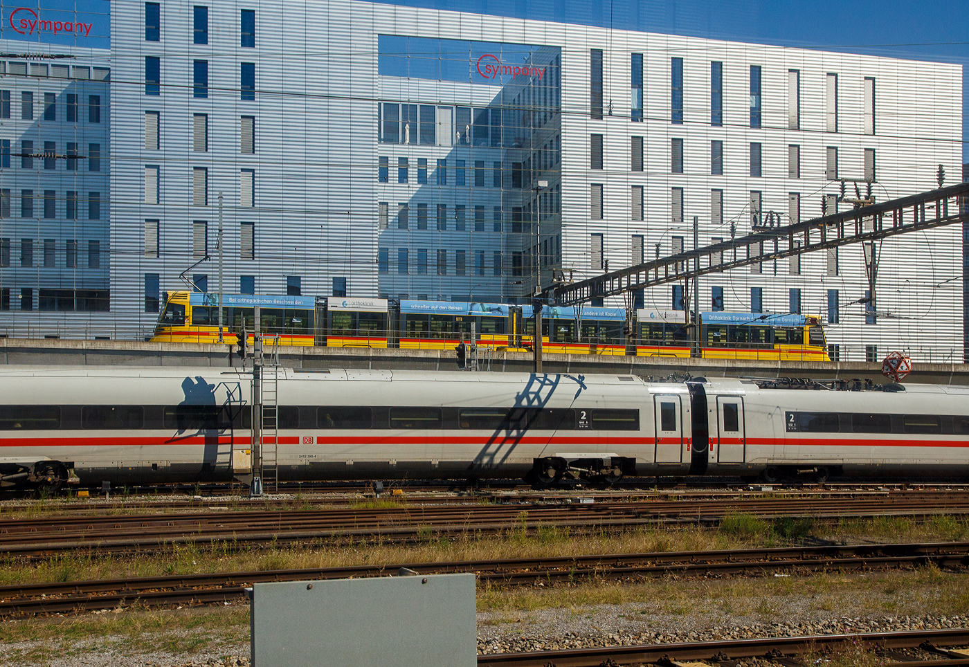 SBB/BVB: Bahnhof Basel St. Johann am 1. April 2016. Das renovierte schmucke Bahnhofsgebäude befindet sich zwischen der normalen und der schmalen Spur. Zum Zeitpunkt meiner Ankunft konnte der BVB Be 4/6 628 der Linie 21, Basel St. Johann-Badischer Bahnhof, die nur von Montag bis Freitag von den beiden letzten Düwags 627 und 628 bedient wird verewigt werden. Schon bald sollen sie in den Bestand der Museumsfahrzeue überführt werden.