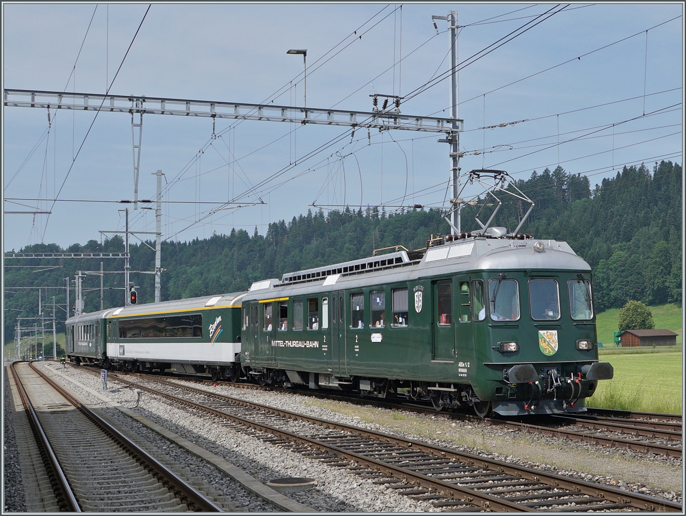 Überraschung: Vom Bodensee kommend (Rorschach) erreicht der VH-MThB ABDe 4/4 N° 12 mit dem  Bodan -Salon-Wagen und dem VH-MThB BDt Sumiswald-Grünen.