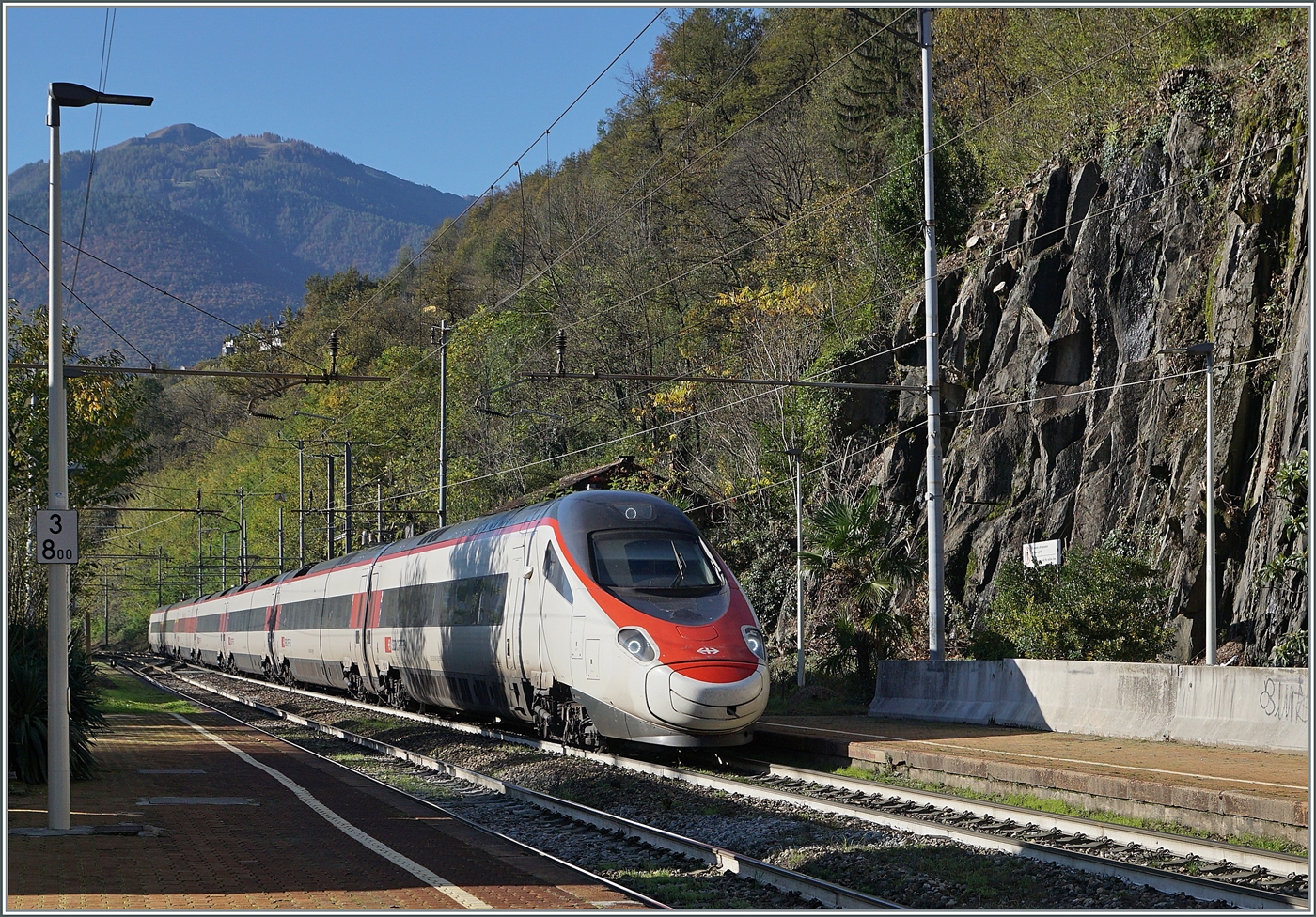 Ein SBB RABe 503 ist als EC 40 auf dem Weg von Milano Centrale nach Genève und fährt durch den Bahnhof von Preglia. 31. Oktober 2024