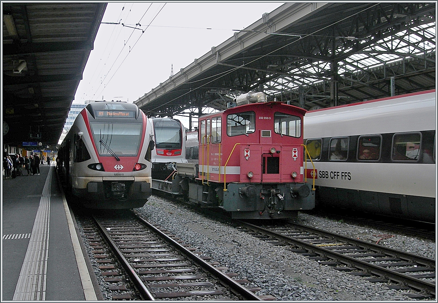 Der SBB RABe 523 018 hofft in Lausanne auf möglichst wenige Fahrgäste für seine Fahrt nach Grandson.