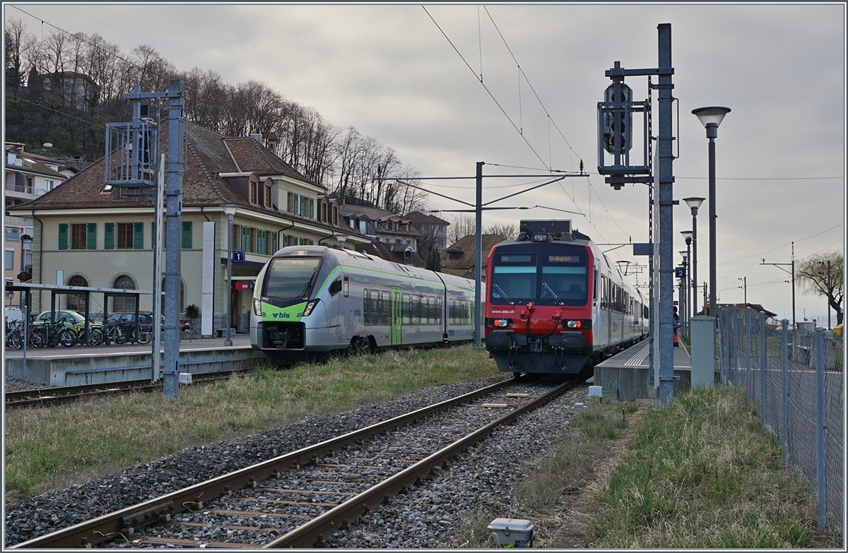 Der BLS RABe 528 109 wartet in St-Gingolph der als R 91 6125 auf die Abfahrt nach Brig.