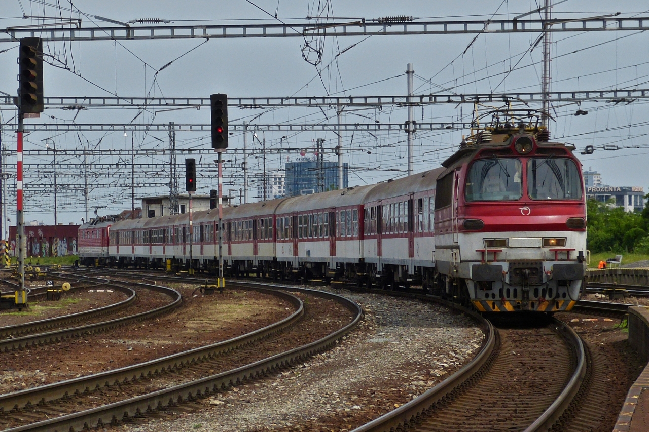 E-Lok 240 089-3 (91 56 6 240 089-3) zieht den Sandwich Personenzug in den Bahnhof von Bratislava. 05.06.2023