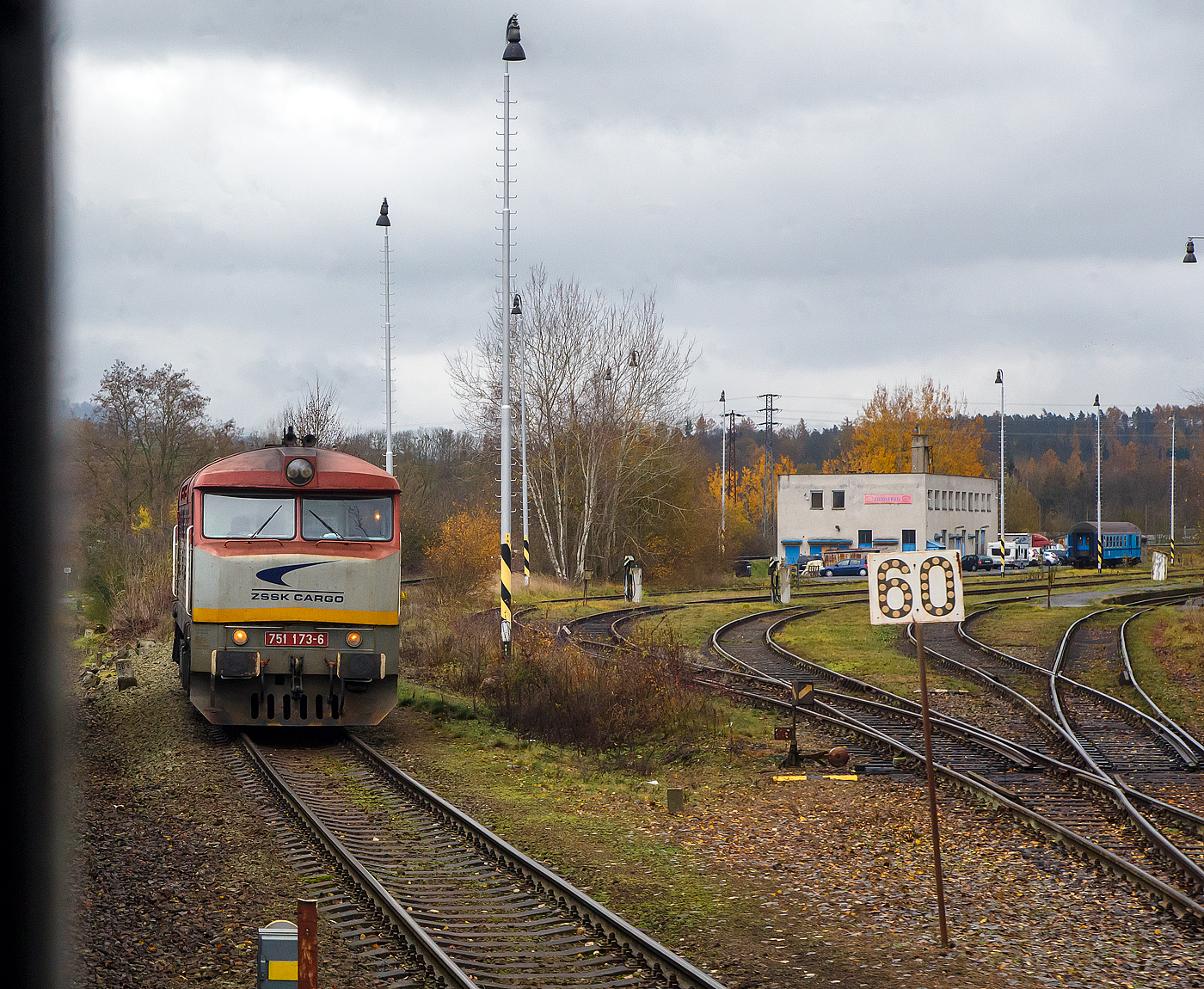 Wir erreichen am 24.11.2022 mit dem alex EC 360 / Ex 6 (Praha – München) nun den Bahnhof Domažlice (Taus), wo gerade rechts die ZSSK Cargo 751 173-6 rangiert.