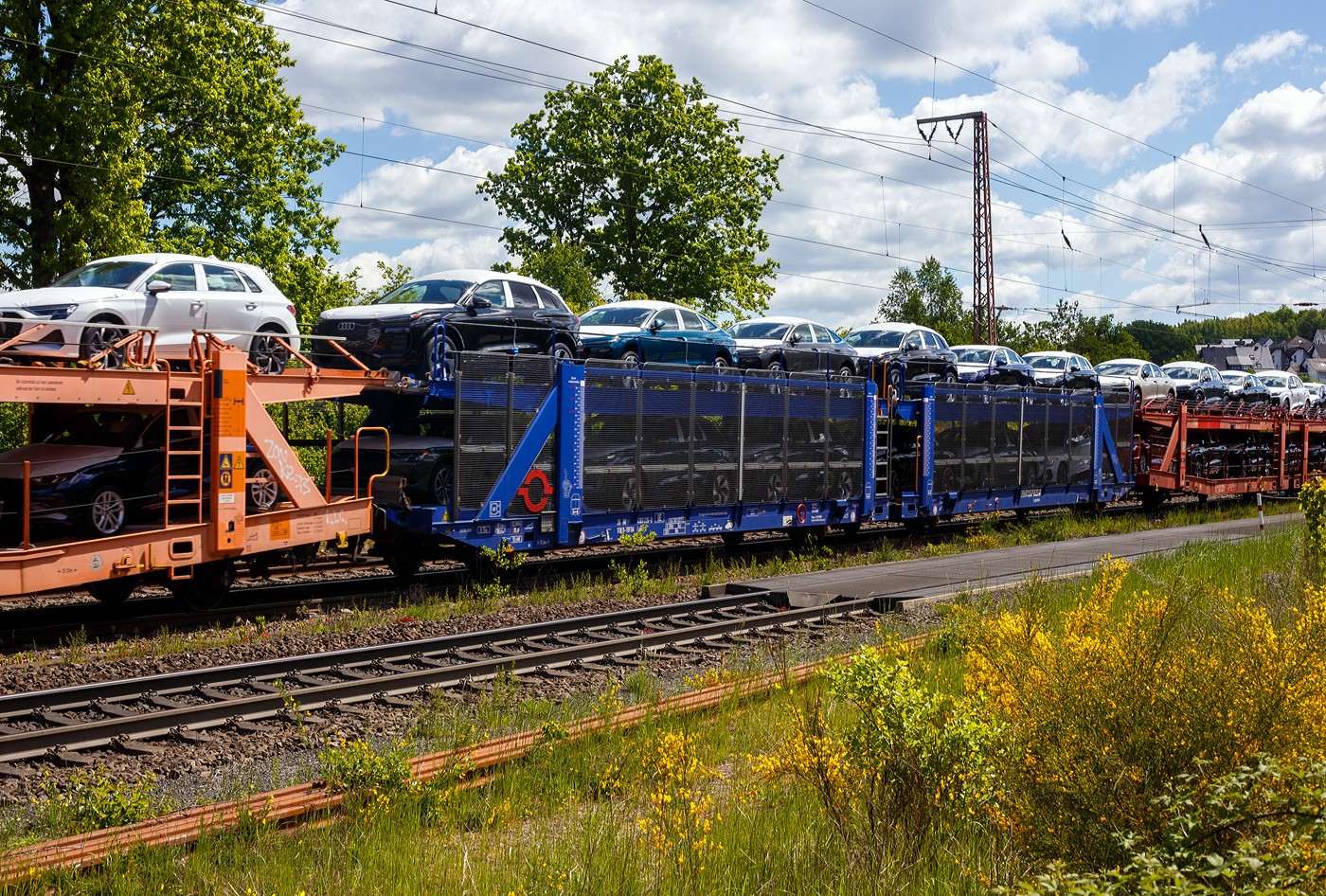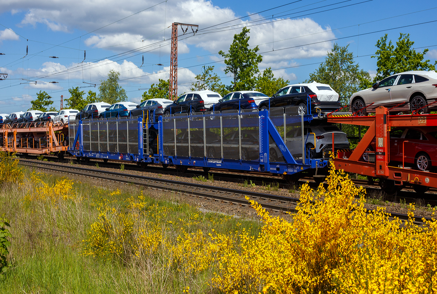 Zweiteilige, 2 x 2 achsige, offene Doppelstock-Autotransportwagen-Einheit, RIV 24 71 4370 030-7 E-TRFSA, der Gattung Laaers (142), des spanischen Transport- und Logistik-Unternehmens Transfesa (Transportes Ferroviarios Especiales S.A.) / HISPANAUTO, im Zugverband am 09.04.2017 bei einer Zugdurchfahrt im Bahnhof Marburg (Lahn).