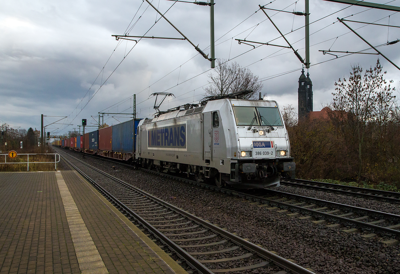 Die HHLA 386 039-2 (91 54 7386 039-2 CZ-MT) der METRANS Rail s.r.o. (Prag / Praha) kommt am 07.12.2022 aus südlicher Richtung (aus Tschechien), auf der auf der Elbtalbahn (KBS 247), mit einem Containerzug und fährt durch Dresden-Strehlen in nördlicher Richtung (vermutlich nach Hamburg). Die METRANS gibt es schon über 30 Jahren, sie ist ein 100 %-iges Tochterunternehmen der Hamburger Hafen und Logistik AG (HHLA).