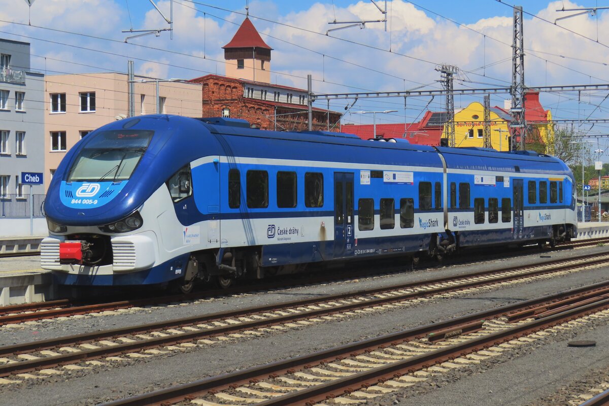 Der ČD „RegioShark“ 844 005-9 (CZ-ČD 95 54 5 844 005-9), ein Dieseltriebzug vom Typ PESA LINK II, hat am 18 April 2023 als Os 17138 nach Nove Hamry (Neuhammer) den Bahnhof Karlovy Vary (Karlsbad oberer Bahnhof) erreicht. Er muss jedoch erst abwarten bis die Strecke frei ist, bevor er weiterfahren kann. Armin Schwarz