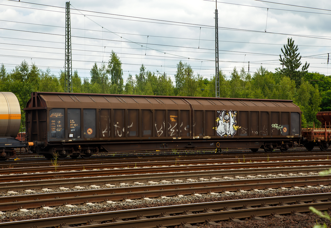 Vierachsiger, großräumiger Schiebewandwagen 31 55 2870 122-2 H-RCH, der Gattung Habbinss, der Rail Cargo Hungaria (Ein Unternehmen der ÖBB), am 16.03.2022 im Zugverband bei der Zugdurchfahrt in Niederschelden (Sieg).